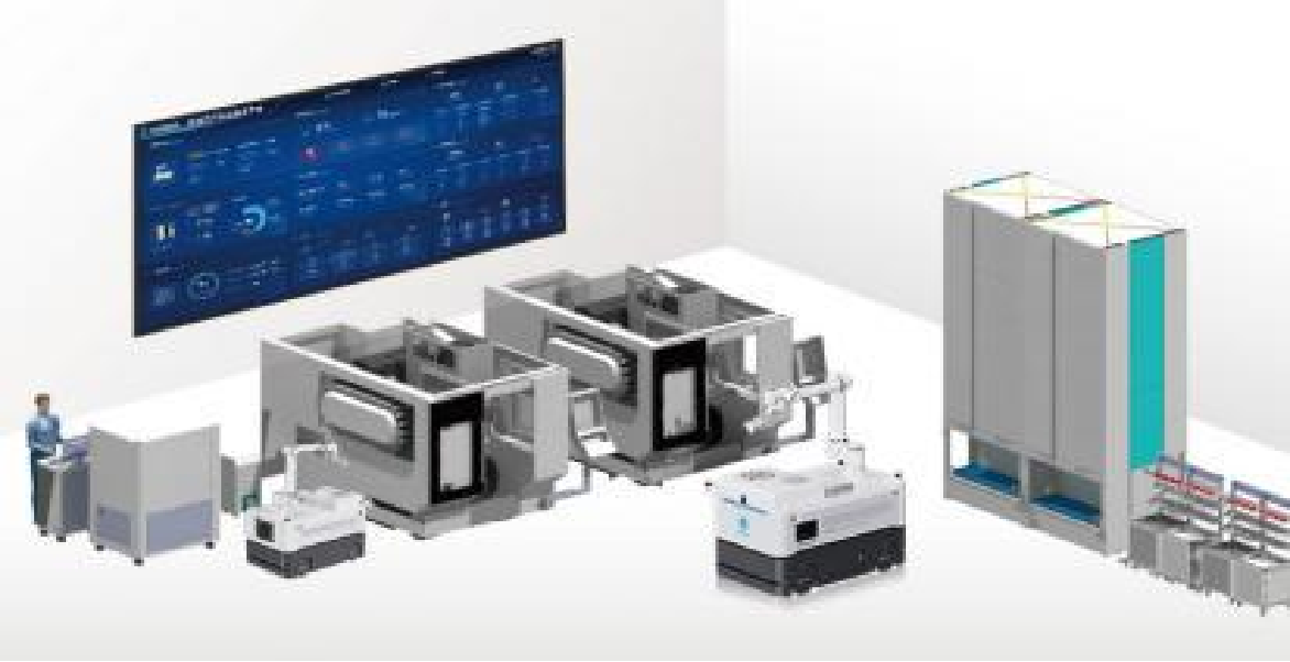 AMR unit, machining unit (machine tool), AGV docking unit, buffer unit, ROS resource scheduling system, MES (Manufacturing Execution System), WMS (Warehouse Management System).